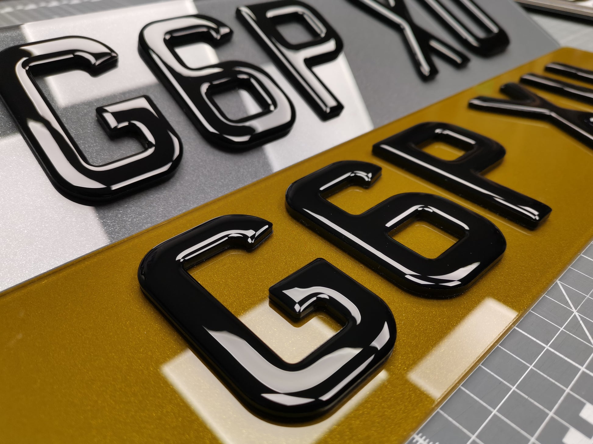 PLEASE NOTE: tinted plates, plates with custom bottom line text, and modified characters are not legal to use on UK highways.